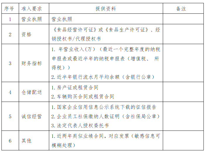 7、投標(biāo)人須具有國家行政主管部門頒發(fā)且在有效期內(nèi)的《食品經(jīng)營許可證》或《食品生產(chǎn)許可證》,其中《食品生產(chǎn)許可證》的“食品類別”、《食品經(jīng)營許可證》的“經(jīng)營范圍”中須包含本次采購的食品名稱或食品所屬分類。(如:《食品流通許可證》的“許可范圍”中的“預(yù)包裝食品”)。